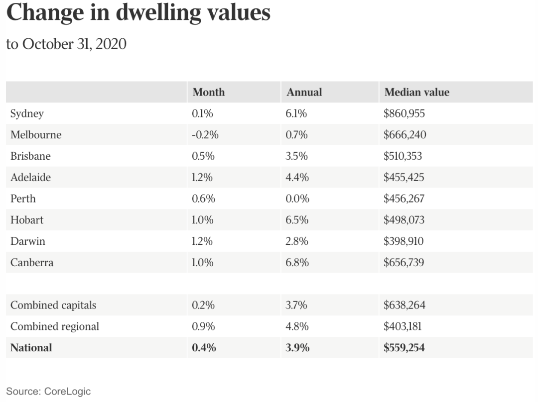 不過根據地產研究機構CoreLogic最新的數據顯示:自疫情爆發以來,澳洲房價首次出現了整體上漲10月份澳洲全國住宅房產價格整體上漲了0.4%,中位價達到559254澳元。除了遭受第二波疫情的墨爾本房價仍有小幅下降之外,其他首付城市房價均在上漲。業內專業人士稱,各種數據表明澳洲房市或以觸底。