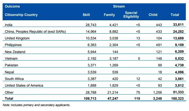 2018-19財年澳洲總共發出160,323個永居簽證,同比2017-18財年減少了2094個;