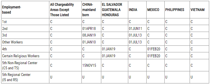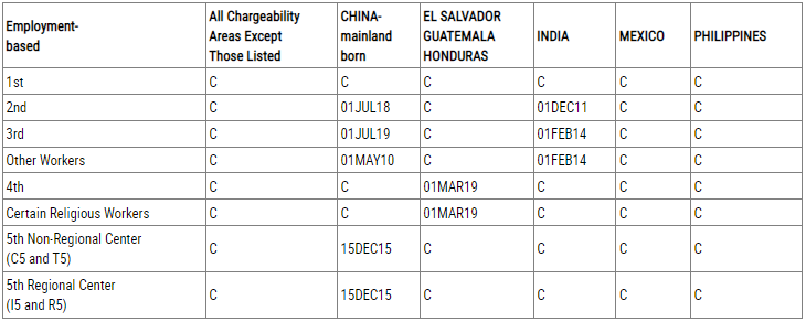 根據(jù)職業(yè)移民排期表B,EB-1、EB-4類別繼續(xù)無排期,EB-2、EB-3、EB-5類別沒有前進(jìn),原地踏步。