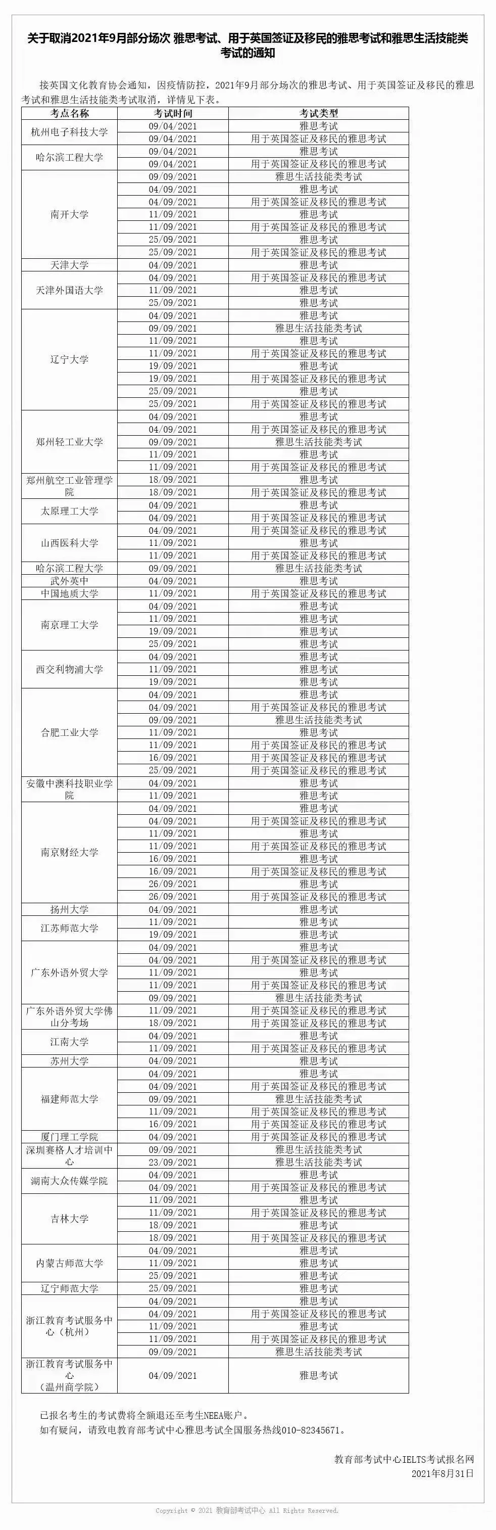 8月31日,教育部考試中心IELTS考試報名網(wǎng)發(fā)布一則通知:接英國文化教育協(xié)會通知,因疫情防控,2021年9月部分場次的雅思考試、用于英國簽證及移民的雅思考試和雅思生活技能類考試取消。已報名考生的考試費(fèi)將全額退還至考生NEEA賬戶。詳情見下表。