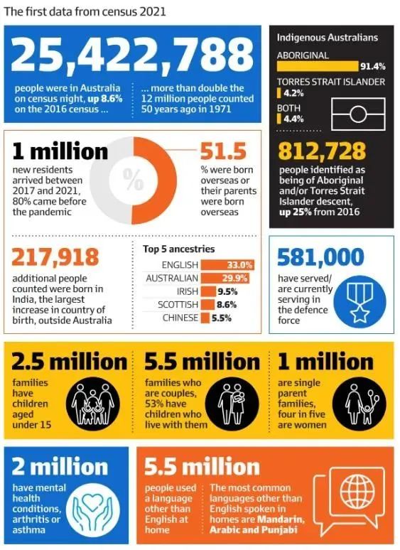 6月28日,澳洲統(tǒng)計局公布了2021年人口普查結(jié)果,涉及人口數(shù)量、各國移民數(shù)量等多個方面。