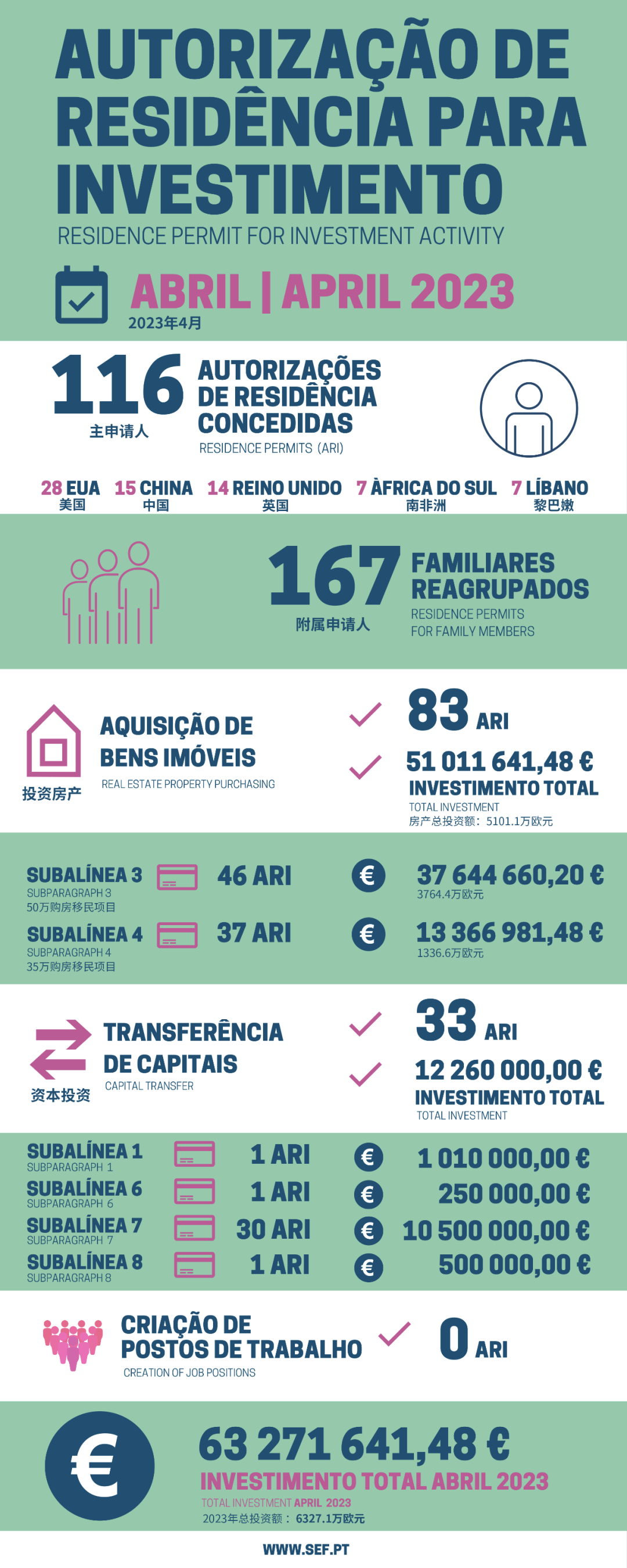 近日,葡萄牙移民局(SEF)正式發(fā)布了4月的黃金簽證最新統(tǒng)計數(shù)據(jù)。4月共有116位主申請人和167位附屬申請人獲批葡萄牙黃金簽證。獲批總?cè)藬?shù)為283人,總投資額約6327萬歐元。