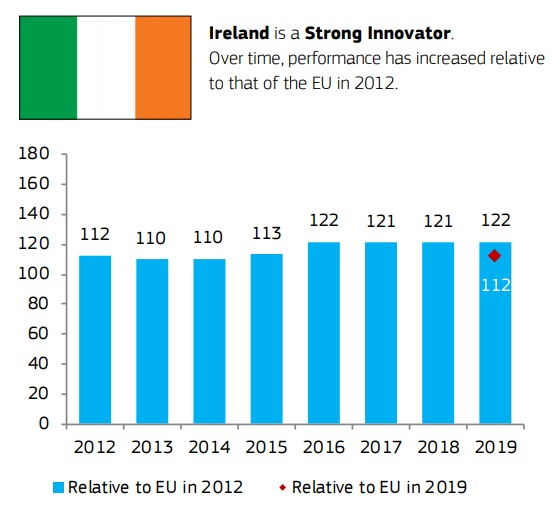 在新公布的《2020歐洲創(chuàng)新記分牌》中,愛爾蘭獲得高達(dá)122的分?jǐn)?shù),遠(yuǎn)高于歐盟平均水平112分,再度榮獲“歐洲強(qiáng)大創(chuàng)新者”稱號(hào)。報(bào)告指出,愛爾蘭當(dāng)前更為核心、重要的創(chuàng)新優(yōu)勢(shì)集中體現(xiàn)在就業(yè)影響力、人力資源和充滿吸引力的科研體系。