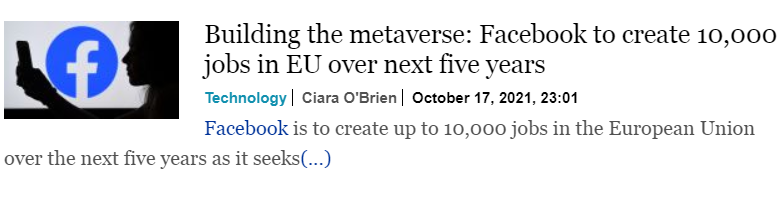 Facebook將在愛爾蘭和歐洲開啟萬人招募計(jì)劃,構(gòu)建元宇宙!