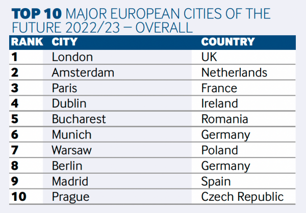 2月17日,《金融時(shí)報(bào)》旗下的《FDi Intelligence》發(fā)布最新《2022-2023年度歐洲未來(lái)城市和地區(qū)》報(bào)告,通過(guò)評(píng)估歐洲356個(gè)城市和148個(gè)地區(qū),倫敦、阿姆斯特丹、巴黎、都柏林和布加勒斯特名列前茅,被評(píng)為歐洲五大最具投資價(jià)值城市。