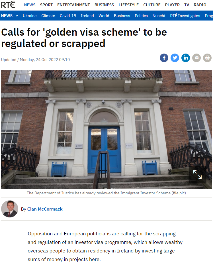 激增的移民申請(qǐng)數(shù)據(jù)迅速引起了業(yè)界關(guān)注。10月24日,據(jù)愛爾蘭國(guó)家廣播電臺(tái)RTÉ報(bào)道,愛爾蘭反對(duì)派和部分歐洲政界人士呼吁廢除或監(jiān)管“愛爾蘭投資移民計(jì)劃”。