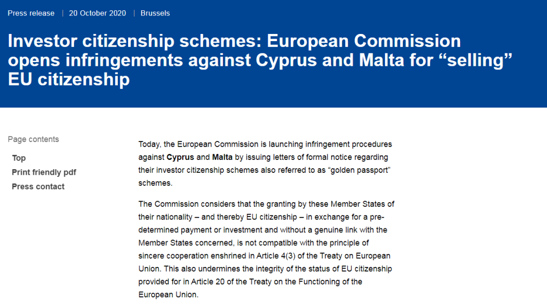 10月20日,歐盟委員會發(fā)布公告,宣布就“黃金護照”項目向塞浦路斯和馬耳他下發(fā)“正式通知函”,要求兩國政府在2個月內做出答復,據(jù)此正式啟動對塞浦路斯和馬耳他的訴訟程序。