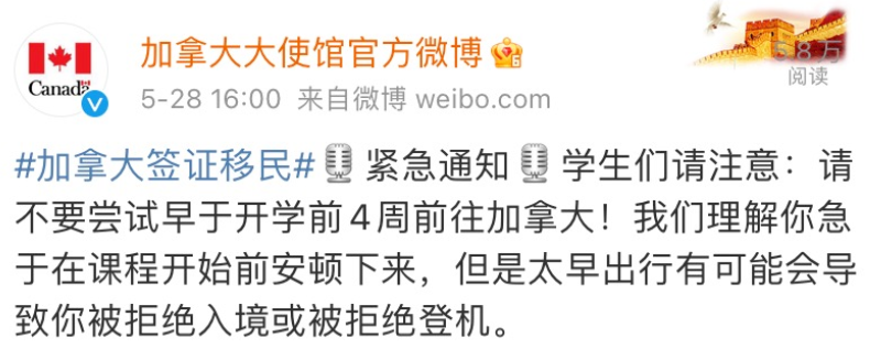 加拿大駐華使館緊急發布最新提醒:留學生請勿早于開學前四周抵達加拿大,極有可能被海關拒絕入境或被拒絕登機!如果9月7日開學,那么往前回溯四周28天,則不要預定早于8月10日抵達加拿大的航班。