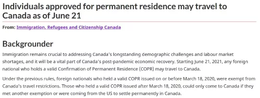 從2021年6月21日起,有效的COPR(移民永居確認(rèn)信)持有者可以登陸加拿大啦!