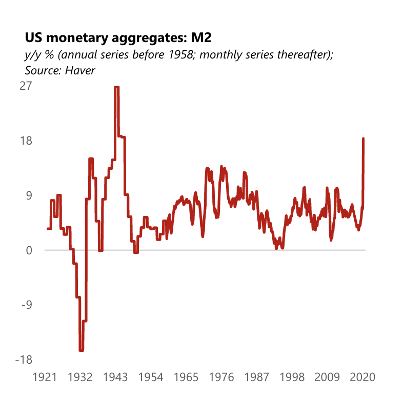 與央行資產負債表迅速擴張相對應的是貨幣總量的急劇膨脹。美聯儲數據顯示,美國的M2增速已達到1981年以來的最高峰,今年的增速有望達到二戰時期的最高水平。