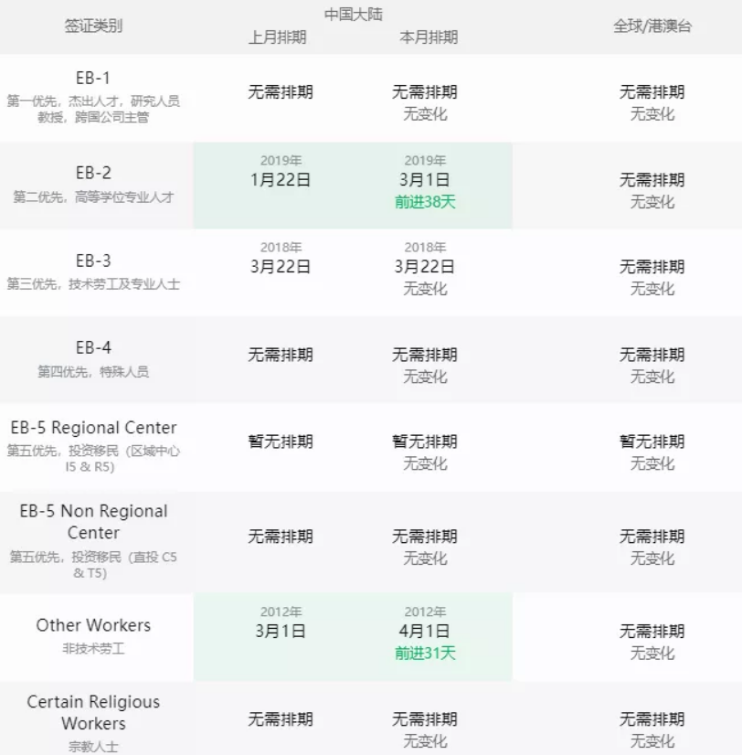 ·EB-2(具高等學(xué)位或特殊能力者)前進(jìn)38天至2019年3月1日;