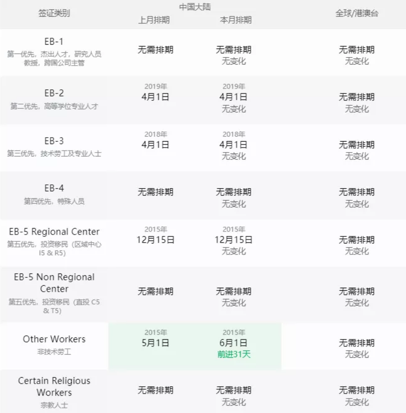 ·EB-3技術(shù)類無變化,非技術(shù)類前進(jìn)31天至2015年6月1日;