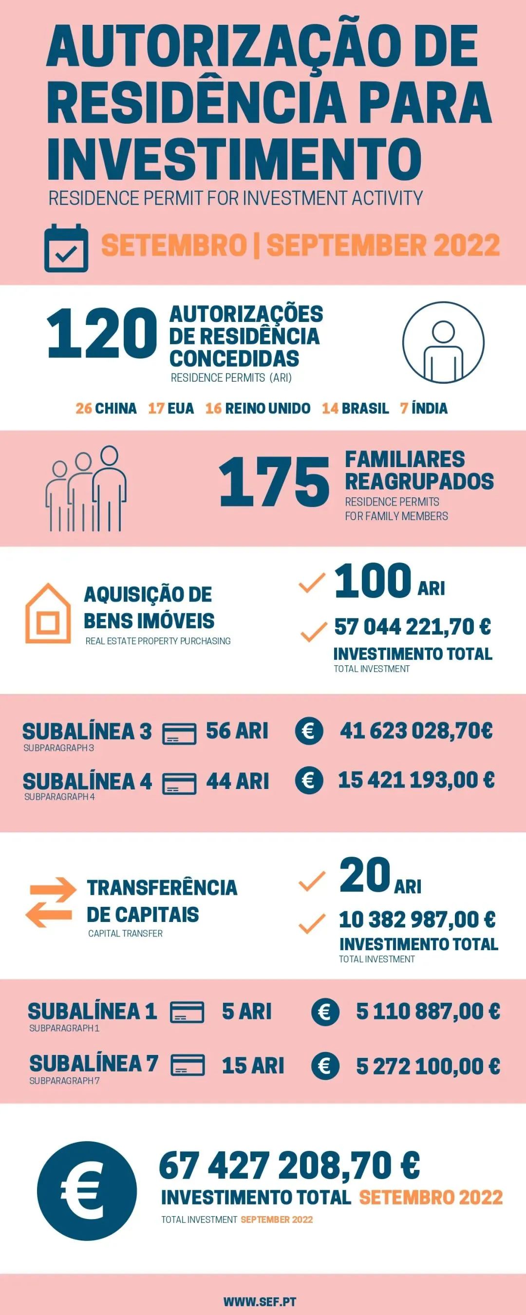 10月8日,葡萄牙移民局發(fā)布了9月的黃金簽證審批數(shù)據(jù),共有120位主申請人和175位附屬申請人獲批,總投資額約6743萬歐元。2022年前9個月,葡萄牙移民局已經(jīng)給926戶家庭簽發(fā)了黃金簽證,超過了2021年全年的簽發(fā)量。