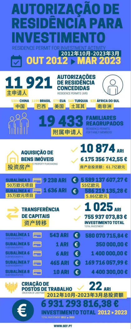 葡萄牙移民局(SEF)正式發布了黃金簽證的3月最新統計數據。2023年3月共有163位主申請人和262位附屬申請人獲批葡萄牙黃金簽證。獲批總人數為425人,總投資額約7849.5萬歐元。