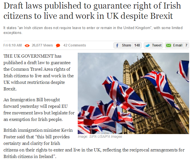 3月5日,英國發(fā)布一項移民法案(草案),廢除歐盟的自由流動法,但對歐盟國愛爾蘭除外。該法案再次重申,英國脫歐后,愛爾蘭公民依然可享受在英國自由定居、生活的共同旅游區(qū)(CTA)特權。而其他歐盟國公民,則需另行申請英國居留簽證才可定居英國。